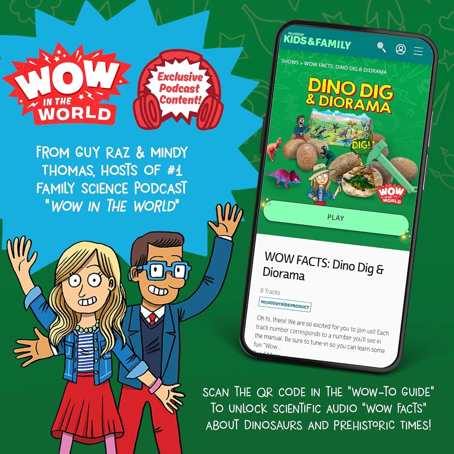 Step into the role of paleontologist as you excavate dinosaur figures from plaster dino eggs! This kit comes with ten dino eggs for you to dig into and discover ten different dinosaur figures. Once you’ve excavated all the dinosaurs, assemble the cardboard diorama and set up your very own dinosaur museum exhibit! Place the dino figures and prehistoric plant stickers in their spots along the prehistoric timeline. Includes durable excavation tools (rock hammer and chisel) and an eight-page, full-color guide that aids your dig, explains the techniques real paleontologists use when on a dig site, and tells you a little about each dinosaur and prehistoric plant. “Wow in the World”’s Guy Raz and Mindy Thomas are with young explorers every step of the way as they provide fun dino facts through the included exclusive podcast content.