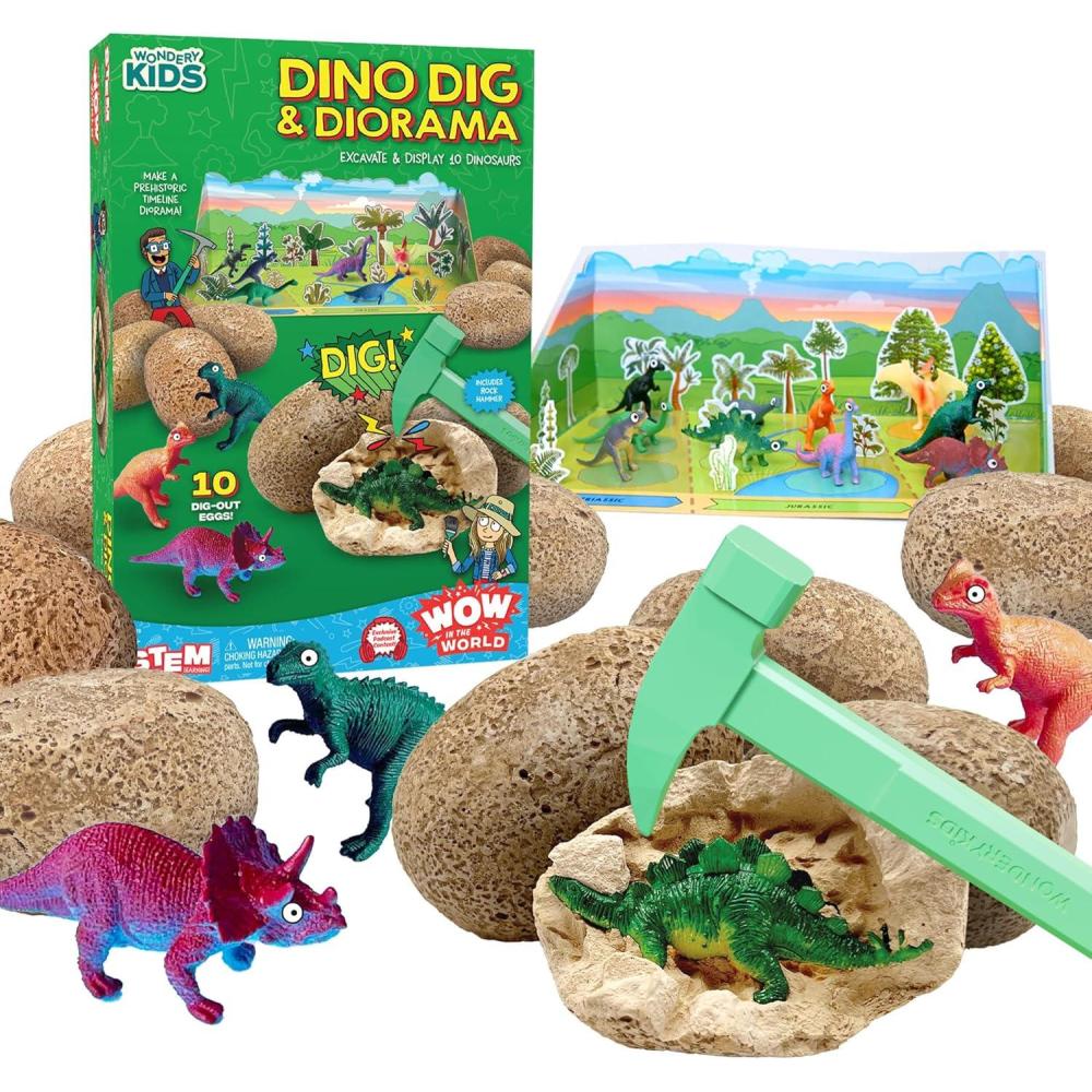 EXCAVATE DINOSAURS – Step into the role of paleontologist and museum curator with this dinosaur excavation kit! Unearth 10 unique dinosaur figures from plaster eggs, and place them in your very own prehistoric diorama.